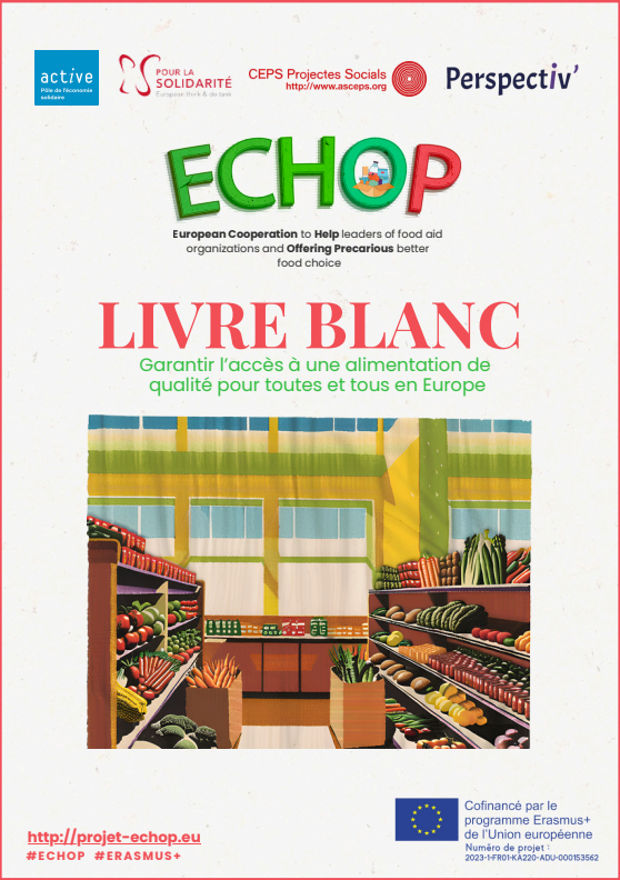 Le livre blanc Garantir l’accès à une alimentation de qualité pour toutes et tous en Europe a été rédigé dans le cadre du projet ECHOP, un projet soutenu par le programme Erasmus+ de l’Union européenne et en partenariat entre Pour La Solidarité, Active, Pôle de l’économie solidaire, Perspectiv’ et CEPS. Pendant 2 ans les partenaires ont travaillé au développement de divers outils pour assurer la montée en compétences des dirigeants vis-à-vis des pratiques innovantes d’approvisionnements. Ces outils sont :
